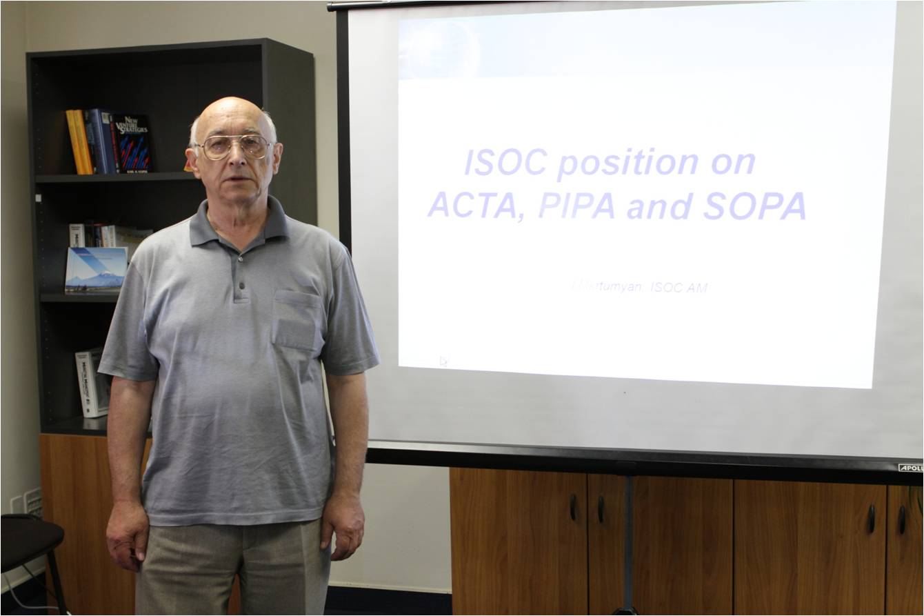 Հունվար 25, 2013թ., Երևան, Հայաստան: Տեղի է ունեցել Հայաստանյան Ապահով Ինտերնետ հանձնաժողովի նիստը, որտեղ քննարկվել են մոտակա ծրագրերը (Safe.am-ը Մեդիակրթության կենտրոնի, ԻՀ ՀԿ-ի, Orange Armenia-ի, Կրթության և գիտության նախարարության կրթական տեխնոլոգիաների Հայաստանի ազգային կենտրոնի, ինչպես նաև Երևանի քաղաքապետարանի համատեղ նախաձեռնությունն է): Հունվար 25, 2013թ., Երևան, Հայաստան: ISOC AM-ի վարչության անդամ Գրիգոր Վահանյանը հրապարակել է հայկական կրթական և լրատվամիջոցների կայքերի վարկանշային աղյուսակը: Դեկտեմբեր 14, 2012թ., Դուբայ, Արաբական Միացյալ Էմիրություններ:ԻՀ ՀԿ-ի փոխնախագահ Գրիգորի Սաղյանը մասնակցել է Համաշխարհային հեռահաղորդակցման կոնֆերանսին WCIT: Վերջնական փաստաթղթեր ստորագրողները: Դեկտեմբեր 8, 2012թ., Երևան, Հայաստան: ԻՀ ՀԿ-ն հովանավորեց ArmNet 2012 համաժողովը: Armnetawards, լավագույն հայկական վեբկայքերը: Հոկտեբեր 14-18, 2012թ.:ԻՀ ՀԿ-ի փոխնախագահ Գրիգորի Սաղյանը մասնակցել է Տորոնտոյում ICANN 45 համաժողովին: Սեպտեմբեր 24-28, 2012թ.:ԻՀ ՀԿ-ի փոխնախագահ Ալբերտ Տոնեյանն ու վարչության անդամ, AMNIC-ի ղեկավար Հրանտ Դադիվանյանը Ամստերդամում մասնակցել են RIPE 65-ի համաժողովին: Սեպտեմբեր 20, 2012թ.: ԻՀ ՀԿ-ն գործարկել է ինտերնետային տարածության անվտանգության մոնիտորինգի կայքը` www.websec.am: Սեպտեմբեր 11-13, 2012թ.:ԻՀ ՀԿ-ի վարչության անդամ Աննա Կարախանյանը մասնակցել է ccTLD-ի ռեգիստրների ու ԱՊՀ, Կենտրոնական ու Արևելյան Եվրոպայի ռեգիստրարների հինգերորդ միջազգային համաժողովին, որը կայացել է Բուդվա քաղաքում (Չերնոգորիա): Աննա Կարախանյանը ներկայացրեց AM դոմենների վարչարարությանը վերաբերող շնորհանդես: Օգոստոս 25-26, 2012թ.: ԻՀ ՀԿ-ի անդամ Արման Աթոյանը մասնակցել է Բեռլինում Եվրոպական Քեմփուս Փարթիին, որը հանդիսանում է ամենամեծ էլեկտրոնային ժամանցային միջոցառումը աշխարհում: Այն օրական 24 ժամ ու մեկ շաբաթյա տևողությամբ տեխնոլոգիական փառատոն է հազարավոր campuseros-ների, հաքերների, ծրագրավորողների, խաղացողների ու տաղանդավոր մարդկանց համար: Հագեցած լինելով համակարգիչներով ու այլ խաղալիքներով, գիշերելով տեղում` նրանք ընդգրկղվում են յուրօրինակ միջավայրի մեջ: 2012թ., օգոստոս: Սեմինար ԻՀ ՀԿ-ի դիրքորոշումը ACTA, SOPA և PIPA-ի ակտերի վերաբերյալ: 2012-ը, հուլիս: Ջովան Կուրբալաջայի «Համացանցի կառավարում» գրքի շնորհանդեսը`հրապարակված հայերեն լեզվով: Հուլիս 6, 2012թ.: IPv6-ի օր Հայաստանում: ԻՀ ՀԿ-ն ու ASNET-AM-ը կազմակերպեցին IPv6-ի օր Հայաստանում: Ա. Պետրոսյանը հանդես եկավ Հայաստանի ակադեմիական և հետազոտական IPv6 ցանցի բարելավման պատրաստակամության շնորհանդեսով: Ի. Մկրտումյանը ներկայացրեց Հայաստանում IPv6-ի վիճակն ու առկա խնդիրները, որոնք պետք է լուծում ստանան: Հունիս 15, 2012թ.: ԻՀ ՀԿ-ն կազմակերպել էր Digitec Business Forum-ում կլոր սեղան` քննարկելու Freenet.am-ի անցյալի, ներկայի ու ապագայի խնդիրները: Հունիս 1, 2012թ.: ISOC-ի դրամաշնորհային ծրագրի կոմիտեն ընտրեց ԻՀ ՀԿ-ի <<Հայաստանի կույրերի ու թույլ տեսողություն ունեցողների միության մշակութային կենտրոնում ինտերնետ հասանելիության կենտրոն ստեղծելու>> նախագիծը` ֆինանսավորման համար: Ապրիլ 22-24, 2012թ.: ԻՀ ՀԿ-ի անդամ Կարեն Գասպարյանը մասնակցել է Global INET 2012-ի կոնֆերանսին: Հունվար, 2012թ.: ICANN, ԱՄՆ: ԻՀ ՀԿ-ն դարձավ ICANN-ում ALAC-ի անդամ:Դեկտեմբեր 7, 2011թ.: ԻՀ ՀԿ-ն հովանավորեց ArmNet 2011 Armnetawards համաժողովը` լավագույն հայկական վեբկայքեր: