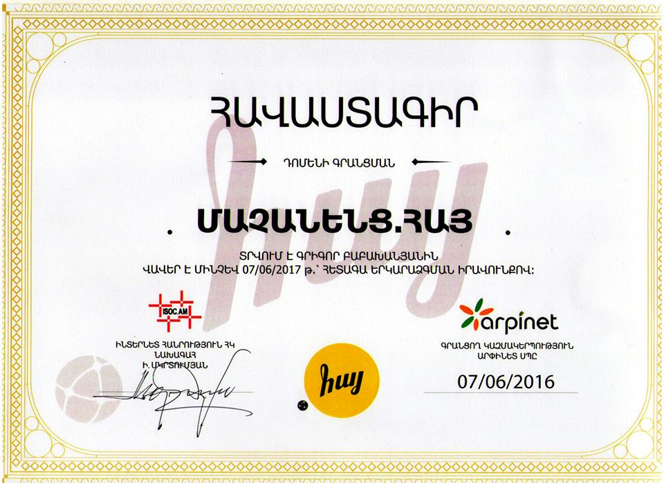 Մայիս 26, 2016. Երևան, Հայաստան. Իգոր Մկրտումյանը և Արման Ներսիսյանը ընտրվեցին buh.am նախագծի վարչության անդամ: Նախագծի նպատակն է՝ ներկայացնել Հայաստանի համալսարանների Ինտերնետում: Մայիս 24, 2016. Երևան, Հայաստան. Իգոր Մկրտումյանը և Լիաննա Գալստյանը անցկացրեցին նոր ԻՀ ՀԿ անդամների առաջին խմբի նիստը: Նիստի նպատակն էր ծանոթացնել նոր անդամներին Ինտերնետ միության նպատակների, ռեսուրսների և գալիք միջոցառումների հետ: Ներկա էին հետևյալ անդամները՝ Քրիստինա Հակոբյան, Գևորք Ալեքսանդրյան, Լիլիթ Խաչատրյան, Լիանա Գզողյան, Աննա Պետրոսյան, Թենգիզ Կարապետով, Եվգենիյա Ղազարյան, Միխեիլ Ակոպով, Ասղիկ Ազարյան, Անի Սիմոնյան, Մամիկոն Արաքելյան, Նարեկ Վարդանյան, Քրիստինե Գեվորքյան, Մարգարիտա Հովհաննիսյան: